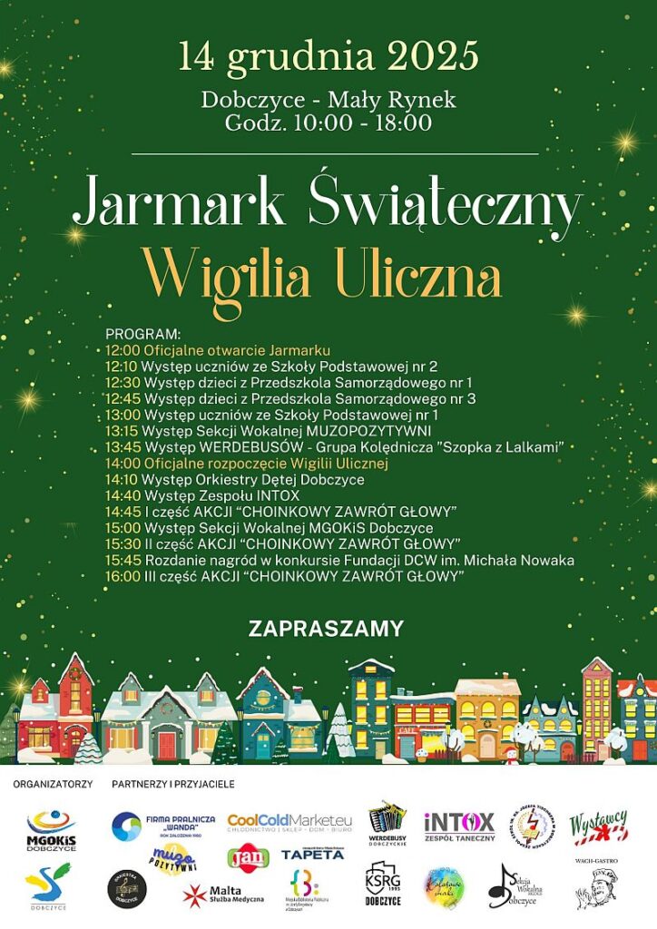 Gmina i Miasto Dobczyce oraz MGOKiS Dobczyce, we współpracy z Zespołem Szkół im. Józefa Tischnera w Dobczycach zapraszają na Jarmark Świąteczny oraz tradycyjną wigilię uliczną, które odbędą się w sercu miasta, w Małym Rynku już 14 grudnia 2025 r.