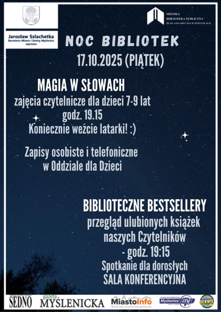 W piątek, 17 października Miejska Biblioteka Publiczna im. księdza Jana Kruczka w Myślenicach zaprasza na wyjątkowy wieczór pełen książek, inspiracji i dobrej atmosfery! Najmłodszych Czytelników (7–9 lat) na godz. 19:15 na zajęcia czytelnicze pełne zabawy i literackich niespodzianek! Konieczne będzie zabranie ze sobą latarki! Zapisy: osobiście lub telefonicznie w Oddziale dla Dzieci.